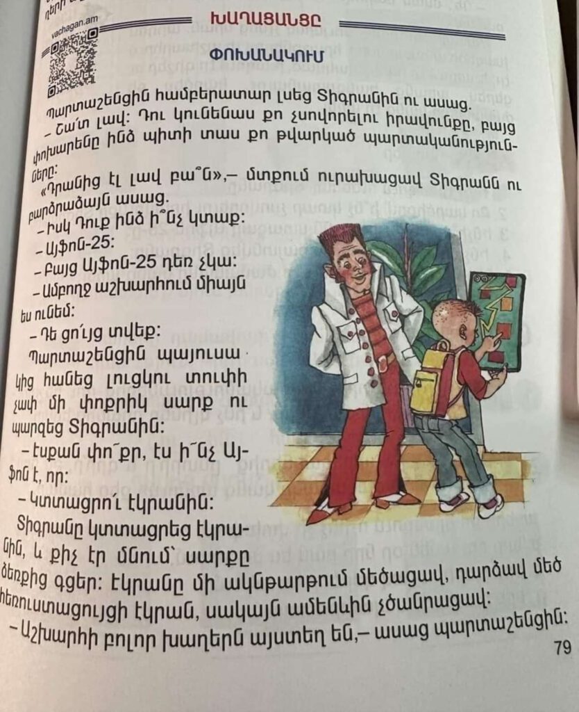 «Վաչագան Սարգսյանի ղեկավարած խմբի ստեղծած, 2024 թվականին «Անտարես» ՍՊԸ-ի տպագրած 3-րդ դասարանի «Մայրենի 3, մաս 1» դասագրքի կազմի վերաբերյալ նույնպես ԿԳՄՍ նախարարությունը ստացել է բողոքներ: Պարզաբանում ստանալու եւ ըստ անհրաժեշտության դասագրքերը լրամշակելու վերաբերյալ պահանջ-բողոքներն ուղարկվել են հեղինակներին: Դասագրքերի լրամշակված էլեկտրոնային տարբերակները տեղադրվել են ԿՏԱԿ-ի «Պաշարների շտեմարան» բաժնում եւ ԴՏՀՏՇՀ-ի կայքէջում»,- պարզաբանել է ԿԳՄՍ փոխնախարար Կարեն Գիլոյանը։