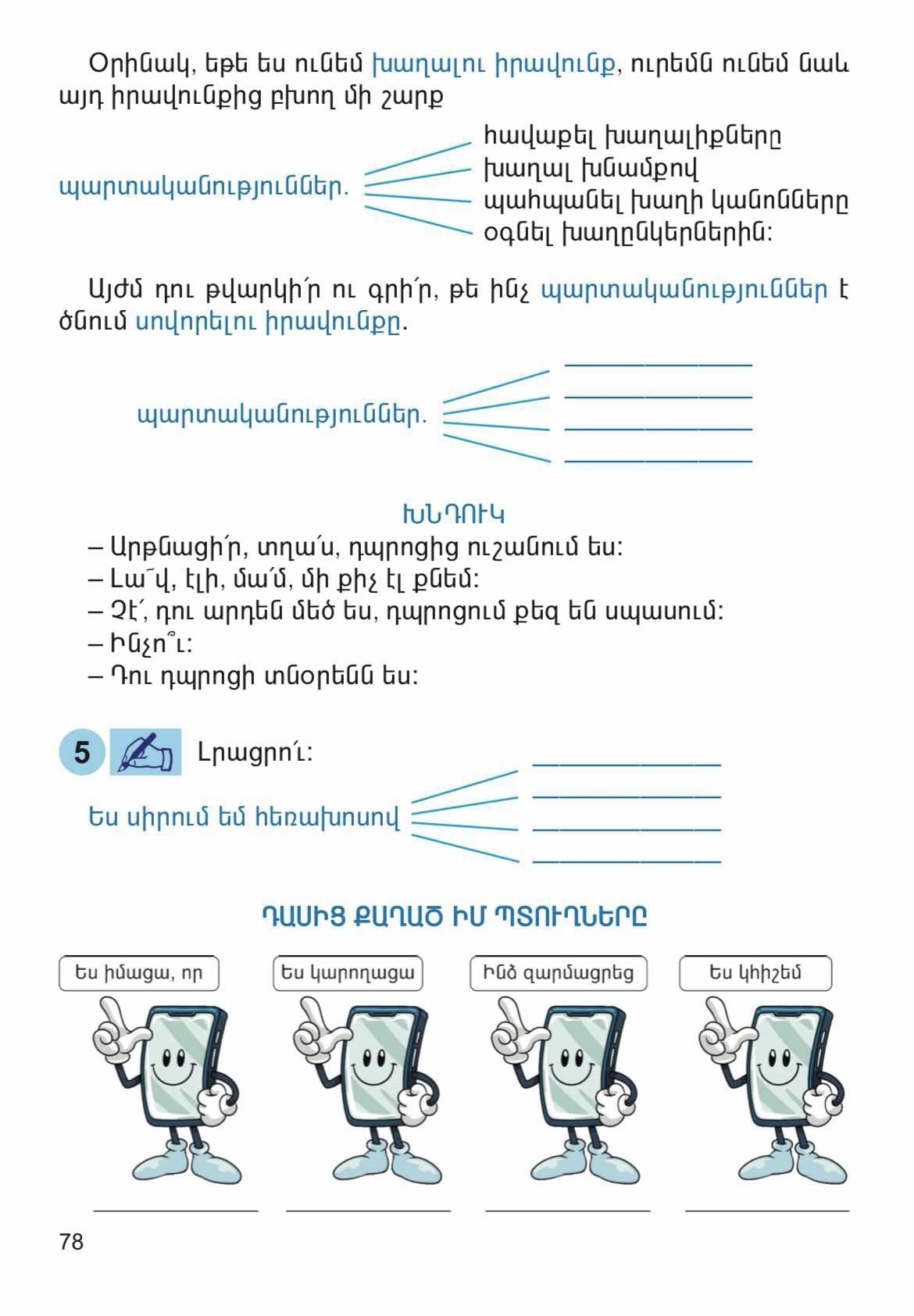 «Ավելին՝ խնդիրը միայն այս դասագիրքը չէ։ Եթե ուսումնասիրեք նաեւ մյուսները, կպատկերացնեք՝ ինչ սարսափելի վիճակ է։ Կան այնքան խրթին թեմաներ, որ այդ տարիքի երեխան ընկալել չի կարող։ Մտքեր, նախադասություններ կան, որ կարդալիս ապշում ես՝ մի՞թե նման բաներ կարելի է գրել դասագրքերում։ Երրորդ դասարանի այս դասագիրքն ընդամենը վառ օրինակ է»,- ասում է Ամալյա Զոհրաբյանը։