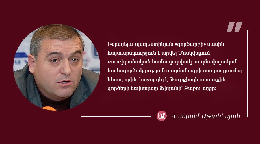 Խիստ ուշագրավ է, որ իսրայելա-պաղեստինյան «գործարքի» մասին պաշտոնական հայտարարություն է արվել Մոսկվայում ռուս-իրանական համապարփակ ռազմավարական համագործակցության պայմանագրի ստորագրումից հետո, որին անմիջապես հաջորդել է Թուրքիայի արտաքին գործերի նախարար Ֆիդանի՝ Բաքու այցը: Այդ մասին ադրբեջանական կողմի տեղեկատվությունը չափազանց սուղ է: Turkgazaetes-ին հայտնում է, որ Ֆիդանը «փուլային հանդիպումներ է ունեցել». նախ բանակցություններ է վարել Ադրբեջանի նախագահ Իլհամ Ալիեւի, ապա՝ արտգործնախարար Բայրամովի հետ: Լրատվամիջոցը Ֆիդան-Բայրամովի մամուլի ասուլիսի ընթացքում Թուրքիայի արտգործնախարարի մի քանի էական հայտարարություն է փոխանցել: Ըստ այդմ՝ նա առաջինը կարեւորել է Գազայում հրադադարի հաստատումը եւ հավելել, որ Թուրքիան ցանկանում է այն «դարձնել մշտական»: